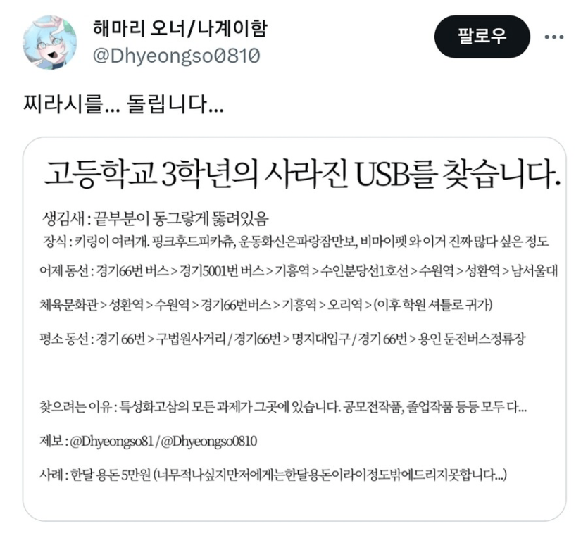 중요한 과제가 든 USB를 잃어버린 고3 학생 > 자유게시판